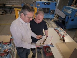 C'est que, et même si la dénomination APAC ne parle pas spécialement au grand public, à moins de vivre dans une grotte à l'entrée obstruée, il y a énormément de chances pour que vous ayez déjà côtoyé ses réalisations sans le savoir. Six millions de sets de table pour les fast-foods Quick ou Burger King, douze millions de dépliants des ballotins de douceurs Leonidas, des montagnes de boites pour capsules de café ou des menus de la compagnie aérienne Brussels Airlines en passant par les CEB et CE1D des écoles… la société dirigée par Benoît Lhost est incontournable dans le façonnage du papier. "Nos clients sont des imprimeurs. Globalement, tous les imprimeurs de Belgique viennent chez nous. Eux nous donnent les feuilles imprimées et nous les façonnons. C’est-à-dire que nous les plions, nous les assemblons, nous les collons pour les transformer en livres, les agrafons pour en faire des brochures. Nous les coupons ou on fait des trous dedans… Une multitude de prestations. Nous sommes sous-traitants. C'est notre secteur le plus important, il emploie 60 personnes". Les suppléments de plusieurs quotidiens nationaux ou… UCM Magazine dont vous dévorez les présentes lignes sont passés par les mains expertes de la société hennuyère. Idem pour les produits alimentaires importés, par exemple, dont les étiquettes blanches avec les ingrédients en français et néerlandais ont été ajoutées à Manage.